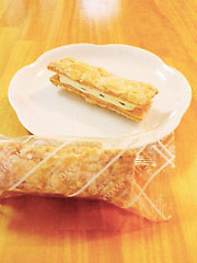 | メモ | 銀座三越限定の、クッキーではなくてサクサクの砂糖がけのパイに挟まれたタイプ。 少し黄味がかったクリームは少しお酒の香りがして、レーズンは甘みが少ない柔らいものがしっかり入ってました。 美味しいので、クッキータイプのものを食べつくした人にオススメ。 |